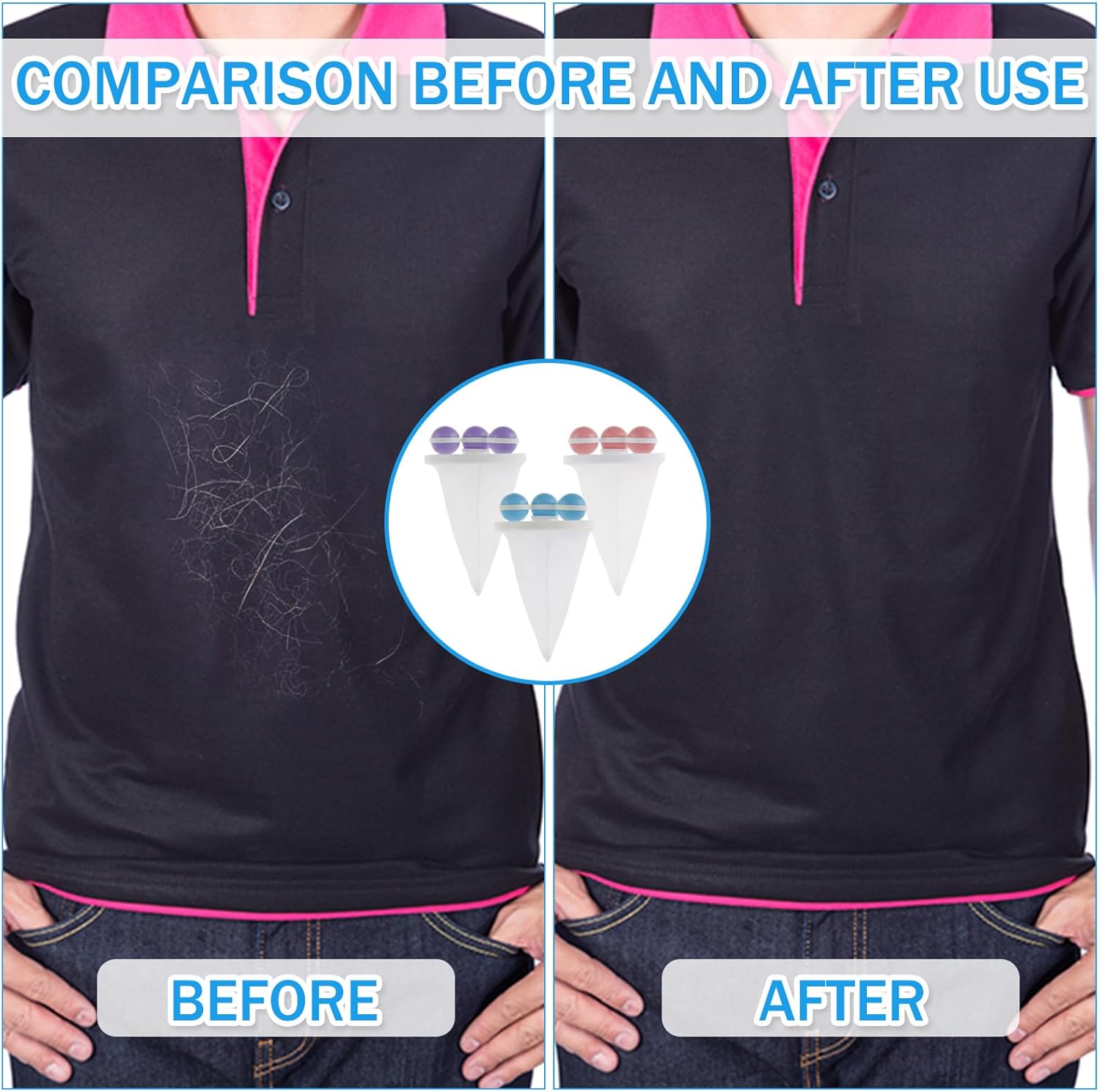Basta colocá-lo sobre a roupa. Ele coleta automaticamente a maioria dos pelos de animais e partículas em suspensão. Após cada lavagem, basta remover os pelos, fiapos e partículas coletados e enxaguar o saco de malha para reutilizá-lo. Este coletor de pelos e fiapos é compatível com máquinas de lavar de abertura superior, tornando-se uma ferramenta inteligente e multifuncional para simplificar sua rotina de lavagem.